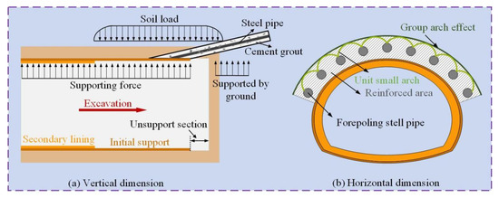 Mechanism of advance pipe roof reinforcement: (a) longitudinal dimension; (b) transverse dimension.