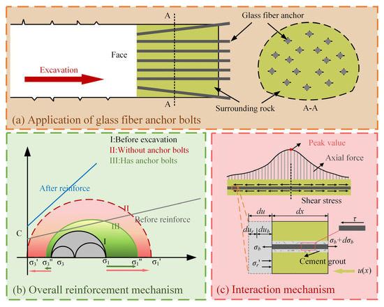 The Glass fiber bolts exhibit high tensile strength, corrosion resistance, and cuttability. In tunnel construction, they do not require removal and can be directly cut and extended with new bolts for reinforcement, thereby significantly enhancing construction efficiency in large-section tunnels. The glass fiber bolts are implanted into the advance core soil through drilling, where they restrict the extrusion deformation of the rock via anchoring action (as shown in Figure 11a). From the perspective of holistic reinforcement mechanism, the bolts enhance the cohesion, internal friction angle, and uniaxial compressive strength of the advance core soil through grouting, thereby shifting the Mohr–Coulomb strength envelope upward. Simultaneously, the restraint provided by the bolts on extrusion deformation effectively inhibits excessive attenuation of the minimum principal stress, promoting the transition of the rock mass stress state from the potential failure zone (Curve 2) to the stable zone (Curve 3). Furthermore, the anchor bolts transfer the stress from the tunnel face to the deeper surrounding rock, enhancing the load-bearing capacity of the advance core soil and facilitating the formation of the arching effect. This effectively suppresses both the pre-convergence and convergence deformations of the surrounding rock (see Figure 11b). The interaction mechanism between anchor bolts and soil demonstrates that glass fiber bolts primarily suppress stress release and deformation of the surrounding rock through interface shear stress, thereby enhancing its stability. Specifically, in the anchored segment near the tunnel face, the direction of shear stress points toward the tunnel face to restrain deformation of the surrounding rock, while in the pull-out segment farther from the tunnel face, the shear stress direction points toward the deeper surrounding rock. The zero-shear stress point (neutral point) corresponds to the location where the relative displacement between the bolt and the surrounding rock is zero. At this point, the axial force in the bolt reaches its maximum and decays to zero toward both ends (see Figure 11c). To analyze its mechanical mechanism, an infinitesimal element dx within the anchored segment is selected to establish a mechanical model. It is assumed that prior to bolt reinforcement, the soil exhibits a certain amount of in situ deformation du. After reinforcement, owing to the interplay between the bolt and the soil, the internal stress within the soil increases, and the corresponding deformation decreases. Overall, the bolt effectively restrains the deformation of the advance core soil through interface shear stress.