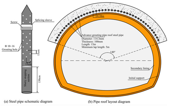 According to the field construction layout, the advance pipe roof support adopted in Tunnel 8# utilizes hot-rolled seamless steel tubes with a diameter of 114.3 mm and a wall thickness of 10 mm. Each steel tube has a length of 15 m with a 5 m overlap, segmented into 6 m and 9 m sections connected by threaded couplings. Grouting holes with diameters of 10–16 mm are drilled on the pipe roof tubes at a spacing of 15 cm in a staggered pattern. A non-perforated grout-sealing segment of 150 cm is reserved at the tail end of each tube (see Figure 12a). The pipe roofs are installed on each connected steel arch frame with a circumferential spacing of 38 cm, arranged over a 140° range of the vault, totaling 39 tubes. A schematic layout of the pipe roof arrangement is shown in Figure 12b.
