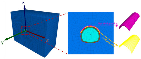This section employs beam structural elements in FLAC3D to establish the numerical model of the pipe roof. The geometric dimensions and layout configuration of the pipe roof are defined according to the field construction conditions. The numerical model is shown in Figure 13, and the mechanical parameters of the pipe roof are listed in Table 3.