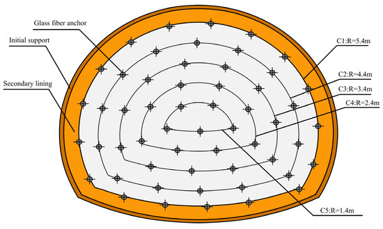 For the B2V section type in a deep-buried segment of Tunnel 8#TA, the surrounding rock mass is fractured and exhibits poor self-stability. In addition to advance pipe roof support, this section requires reinforcement with glass fiber bolts. The glass fiber bolts are manufactured from glass fiber-reinforced thermosetting polyester resin, with a glass fiber content of not less than 60% by weight. They feature a maximum graded thread of 60 mm, an outer diameter of 60 mm, an inner diameter of 40 mm, and a thickness of 10 mm. Cement slurry is used for grouting. The technical parameters of the glass fiber bolt, such as distribution radius, quantity, and overlap length, are shown in Figure 14. A total of 55 bolts are installed in 5 rings arranged from the tunnel contour towards the center of the tunnel face. Each bolt has a length of 18 m with an overlap length of 8 m. Overflow grouting holes with a diameter of 6 mm are drilled in the front section of the glass fiber bolts, spaced at 20–30 cm intervals in a staggered pattern (see Figure 14).