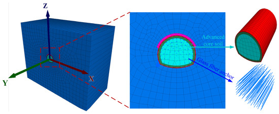The analysis of the mechanism and effectiveness of advanced tunnel face reinforcement has consistently been a research hotspot in the field of tunnel and underground engineering. Numerous scholars worldwide have conducted extensive and productive research on this topic [3,4,5,6,7]. In terms of theoretical analysis, Yi et al. [8], based on an established rockbolt–soil interaction model, used the extrusion deformation of the advanced core soil as a parameter to analyze the reinforcement mechanism under conditions of coupled deformation between rockbolts and soil. They also proposed using a reinforcement coefficient ‘k’ to describe the effectiveness of reinforcement under such coupled deformation conditions. Zhang et al. [9] developed a load-structure model for the pipe roof based on Pasternak’s elastic foundation beam theory. They analyzed the mechanical behavior of the advanced pipe roof during tunnel excavation and noted that increasing the strength of the surrounding rock can significantly enhance the support effectiveness of the pipe roof. Rong et al. [10] established an arc-axis theoretical model for the soil arching effect between steel pipes and, by integrating Pasternak’s elastic foundation beam theory, analyzed the deformation mechanism of a tunnel advanced pipe roof under the pressure of the surrounding rock. Regarding field monitoring, Zhang et al. [1] applied the ADECO-RS approach to the design and construction of the support system for the Tartaiguille Tunnel. Through field monitoring, they subsequently analyzed the post-construction tunnel convergence deformation and the extrusion deformation of the advanced core soil at the tunnel face. Sun et al. [11], using the Baojiang Road–Heilongjiang Road section tunnel of Qingdao Metro Line 3 (Phase I) as a case study, adopted field tracking monitoring to analyze the influence of ADECO-RS construction on tunnel deformation and surface settlement. Wang et al. [12], based on the engineering case of the 106 Mining Panel in the Yuandian No. 2 Mine, successfully controlled roadway roof collapse by employing a combined support technology of advanced grouting with grouted rock bolts and grouted anchor cables. Monitoring results indicated that this technique effectively restrained the deformation of the surrounding rock, demonstrating significant support effectiveness. Zheng et al. [13] conducted field tests, including in situ stress measurement, loosened zone measurement, and deformation monitoring. Through these, they investigated the large deformation failure mechanism of the Wanhe Tunnel on the China-Laos Railway and evaluated the support effectiveness of the advanced pipe roof in controlling the tunnel’s deformation. The aforementioned research provides important references for the study of advanced tunnel face reinforcement. However, theoretical analyses often highly idealize complex geological and construction processes. Their theoretical models struggle to accurately describe the heterogeneity of the rock mass and the interactions involved in reinforcement. Furthermore, theoretical analysis cannot precisely simulate the spatiotemporal effects inherent in dynamic construction, often leading to discrepancies between predicted outcomes and actual engineering effectiveness. While field monitoring can accurately reflect the mechanical behavior of the surrounding rock during advanced reinforcement, it is limited by the intricacy of in situ geological conditions and the availability of monitoring points. Consequently, in situ testing finds it difficult to comprehensively obtain full-field, multi-dimensional information on the surrounding rock throughout the excavation and advanced reinforcement process. With the maturation of numerical simulation methods, their advantages in terms of cost-effectiveness, precision, and controllability are leading increasingly more scholars to adopt them for investigating issues related to advanced tunnel face reinforcement. Yang Yuan et al. [14] employed a combined approach of numerical simulation and field monitoring to research the advanced pipe roof effectiveness in controlling surrounding rock deformation for a high-speed railway tunnel. Their study investigated various scenarios involving different thicknesses of soft plastic loess layers and their relative positions to the tunnel. Jiang et al. [15], using the Tianshan Tunnel as a case study, utilized finite difference software to perform numerical simulations of different excavation schemes for the shallow-buried tunnel. The analysis examined the support mechanism of advanced pipe roof and the influence of different construction plans on its support effectiveness. Yuan et al. [16], based on the shield tunneling departure project of Guangzhou Metro Line 13, applied an improved BQ method to classify the tunnel surrounding rock. They then utilized finite element software to assess the influence of different parameters of the pipe roof-such as its diameter, number of pipes, grouting layer thickness, and layout range-on its support effectiveness. Liu et al. [17] established a numerical model to systematically investigate the evolution patterns of surface settlement, vault settlement, and internal forces of the support structure during tunnel excavation and support under various conditions. Their study revealed the mechanism of advanced small pipe roof support and further developed an analytical model for evaluating the effectiveness of pre-support. To investigate the performance of six advanced support methods, Li et al. [18] established a FLAC3D 6.0 model to simulate tunnel excavation in a sandy cobble stratum. They obtained the displacement and stress field distributions of the soil around the cavity for each scenario and conducted a systematic analysis of the control effectiveness and influencing mechanisms of different advanced reinforcement methods on tunnel stability. Wang et al. [19] employed the finite difference method to conduct a com