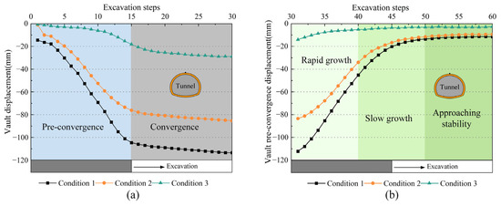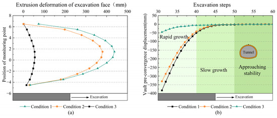 To analyze the pre-convergence and convergence deformation characteristics of the tunnel face under different support schemes, the vertical displacement of the vault at a characteristic cross-section 15 m deep into the model was selected for analysis. The pre-convergence and convergence deformation characteristics of the tunnel vault under different support measures are shown in Figure 16a. As shown in the figure, conditions 1, 2, and 3 all exhibit certain restraining effects on the deformation of the surrounding rock above the vault. However, due to differences in support characteristics among the conditions, the degree of restraint on vault settlement deformation varies. The final convergence value for condition 1 during tunnel excavation is 113.79 mm, with a maximum pre-convergence value of 104.91 mm. For condition 2, the final convergence value is 85.42 mm, with a maximum pre-convergence value of 76.29 mm. For condition 3, the final convergence value is 28.82 mm, with a maximum pre-convergence value of 18.15 mm. The final convergence value and pre-convergence value of condition 2 are reduced by 24.93% and 27.28%, respectively, compared with condition 1, and the final convergence value and pre-convergence value of condition 3 are reduced by 73.10% and 82.69%, respectively, compared with condition 1. Condition 2, with advance pipe roof support, exhibits a significant restraining effect on both the convergence and tunnel vault pre-convergence displacements. Condition 3, which combines bolts with pipe roof support, demonstrates a further enhanced restraining effect on these displacements. This combined support system significantly reduces the pre-convergence deformation rate of the tunnel vault and substantially decreases the final convergence displacement at the tunnel vault.