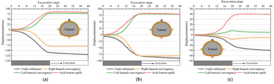 Deformation characteristics of tunnel surrounding rock under different support schemes: (a) condition 1; (b) condition 2; (c) condition 3.
