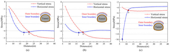 Taking the tunnel center point as the coordinate origin, an analysis was conducted on the variation in the major and minor principal stresses along the path directly above the tunnel. The stress path curves at the tunnel vault under different support conditions are shown in Figure 19. As can be seen from the figure, point I represents the inner boundary of the vertical pressure arch at the tunnel vault, which occurs at the point of peak principal stress. Point O denotes the outer boundary of the vertical pressure arch at the tunnel vault, where the direction of the major principal stress begins to deviate. In Figure 19c, the significant difference between the stresses at the inner and outer boundaries is due to the stress concentration phenomenon occurring in the surrounding rock near the tunnel profile. As the support conditions change, the inner and outer boundaries of the pressure arch directly above the vault also vary, meaning that the distances from these boundaries to the tunnel center point change. Compared to condition 1, the advanced pipe roof support in condition 2 has a relatively limited influence on the extent of the inner and outer boundaries of the pressure arch. In contrast, the combined support measure of advanced pipe roof and glass fiber bolts at the tunnel face in condition 3 reduces the formation range of the radial arching effect around the tunnel to an area near the tunnel profile, at a certain distance outside the contour line compared to both condition 1 and condition 2.