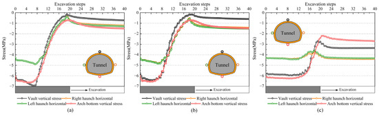 Stress path curves at the tunnel vault under different support conditions: (a) condition 1; (b) condition 2; (c) condition 3.