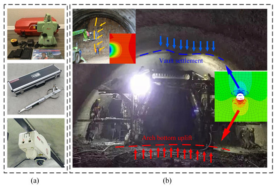 To verify the rationality and reliability of the numerical simulation results in this paper, the field measured data and simulation results are compared and analyzed. The on-site monitoring section is selected at DK11 + 125 of 8# tunnel in F3 section of E60 expressway in Georgia. Before the construction of the secondary lining of the tunnel, TCR702 total station, JSS30A30 convergence meter, CCD binocular camera and other equipment were used to monitor the deformation of the section (Figure 23a). The stability type of the surrounding rock of this section is B, and it is far from the geological structure of the fault. The geological conditions are relatively stable, and it is suitable as a comparison object to verify the simulation results. However, limited by the construction site conditions and monitoring technical means, this study failed to obtain the time-history monitoring data of the whole process of surrounding rock deformation. It can only obtain the final displacement values of several key parts (vault, arch bottom and face center) under the condition of combined support (condition 3) after the tunnel excavation is stable (Figure 23b). Although the data set is limited, these final displacements are one of the most direct and important indicators for evaluating the support effect. To verify the model, the final displacement value obtained by numerical simulation is compared with the field monitoring results (see Table 5).