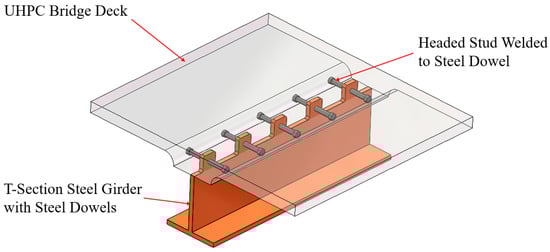 As shown in Figure 3, the dowel–stud hybrid shear connector consists of T-shaped high-strength steel girders, steel dowels welded to the top flange surface, HPC bridge decks, and shear studs welded bilaterally along the steel dowels. The top flange of the I-shaped steel is removed, with the weight of the bridge deck borne by the studs welded on both sides of the steel dowels. Simultaneously, stress concentration is avoided by increasing the load-bearing area of the steel–concrete interface within the connector. Additionally, redundant portions of the concrete slabs on both sides are eliminated, with concrete fillets provided only around the connector to ensure its strength, thereby further reducing self-weight.