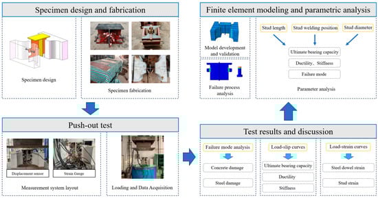 This study conducted static axial push-out tests on six specimens under the conditions of fixed high-strength steel strength, fixed concrete strength, and rectangular steel dowels with rounded corners, to analyze the failure mode, ultimate shear capacity, stiffness, and ductility of dowel–stud hybrid shear connectors. Due to the limited number of specimens, the experimental results may exhibit certain discreteness. The failure process of the connectors was further investigated through finite element analysis. Additionally, parametric studies were performed to examine the influences of the stud length, diameter, and welding layout, systematically exploring the effects of stud parameters on the mechanical behavior of the connectors while maintaining a constant concrete strength and steel dowel geometry. The research process is illustrated in Figure 2.