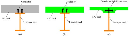 Cross-section of combined beams: (a) traditional steel–concrete beam; (b) HSS–HPC beam; (c) HSS–HPC beam with dowel–stud hybrid connectors.