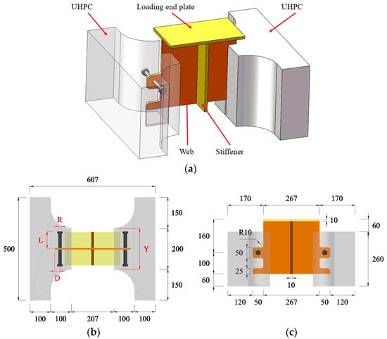 Dowel–stud hybrid connector specimen. (a) Schematic diagram of specimens; (b) top view of specimen dimensions (unit: mm); (c) front view of specimen dimensions (unit: mm).
