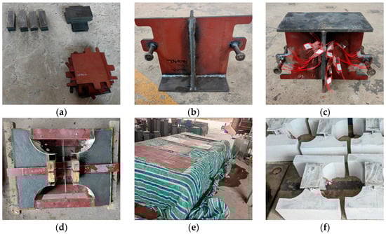 The HPC used in the test was prepared by mixing self-compacting castable materials with steel fibers. The HPC mixture maintained a water-to-glue ratio of 1:10, with steel fibers accounting for 4% of the total mass. The formwork was constructed according to the specified shapes, and continuous vibration was applied during pouring to ensure compaction. Nine 100 × 100 × 100 mm cubic test blocks were prepared alongside the specimens for concrete strength testing. All the specimens and test blocks were cured continuously for three days in a constant-temperature steam-curing chamber at 70 to 80 °C. After natural cooling, putty powder was applied to the concrete surfaces, and identification labels were marked on the sides to complete pre-test preparations. The preparation process of the specimens is shown in Figure 5.