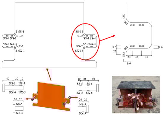As illustrated in Figure 6, strain gauges (3 mm × 5 mm) were strategically bonded to both steel dowels and shear studs to monitor strain distributions during testing. The strain gauge model is BFH120-5AA-D300 (Guangce Co., Ltd., Yiyang, China) with a gauge factor of 2.0 ± 1%. Strain gauges were positioned 4.8 mm from the upper and lower edges of the steel dowels, with four gauges symmetrically distributed on each side. Strain gauges on shear studs were bonded at two critical locations: stud roots and 40 mm above the roots. The strain gauge numbers designate mounting locations. The first letter specifies the orientation relative to the loading direction, where N and S denote the north side and the south side, respectively. The second letter signifies the vertical position, with S indicating the upper surface and X the lower surface.