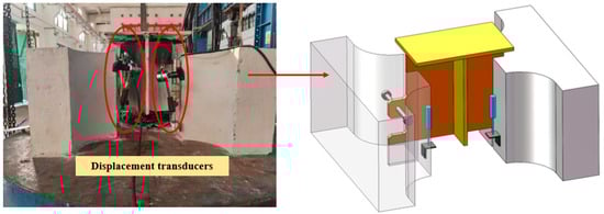 To measure the relative displacement between the steel web and HPC, two vertical displacement transducers were installed on the eastern and western faces of the specimen. The test employed YWC-type displacement transducers with a 50 mm range, a sensitivity of 0.1 mV/mm, and an accuracy of ±0.3% FS. Steel angle plates were bonded to the HPC surface 20 mm above the plate bottom edge, with transducer tips contacting the angle plate surfaces. Swivel-type magnetic bases were attached to the steel plate at the same elevation as the HPC upper surface, as detailed in Figure 7.