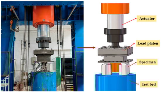 The specimens were subjected to monotonic loading using a 10,000 kN electrohydraulic servocontrolled testing system, with the loading configuration detailed in Figure 8. The test system has a maximum thrust capacity of 10,000 kN and a stroke of ±300 mm, with an accuracy of ±0.5% FS. Due to height constraints, two rigid steel platforms were installed atop the specimen. Minor surface unevenness, resulting from the wooden formwork and manual welding of end plates, was mitigated by manual sand bedding beneath the specimen prior to testing to ensure a uniform load distribution. Throughout loading, the synchronized acquisition of load, displacement, and strain data was performed using the Donghua DH3816N static data acquisition system (Jiangsu Donghua Testing Technology Co., Ltd., Taizhou, China).