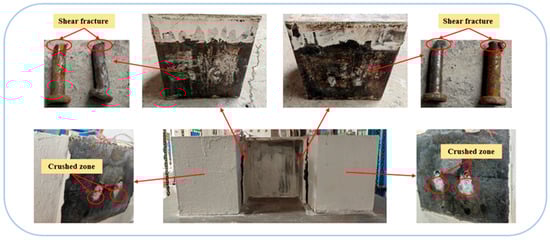 As shown in Figure 10, the failure mode of the steel dowel connector specimen (D0R0L0Y200) primarily exhibited combined mechanisms of plastic deformation in steel dowels and localized concrete crushing beneath the dowels. During the initial loading stages, no significant phenomena were observed. At 350 kN, cracks initiated and propagated on the north and south concrete surfaces. At 385 kN, audible sounds of steel rupture commenced, with the rupture frequency progressively increasing as loading continued. Progressive crushing of concrete beneath the steel dowels triggered accelerated crack propagation on north–south surfaces, culminating in specimen failure.