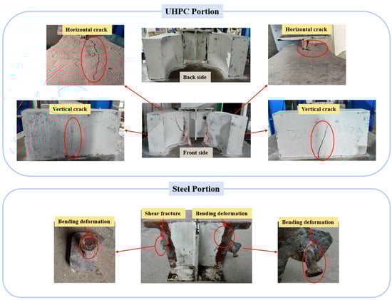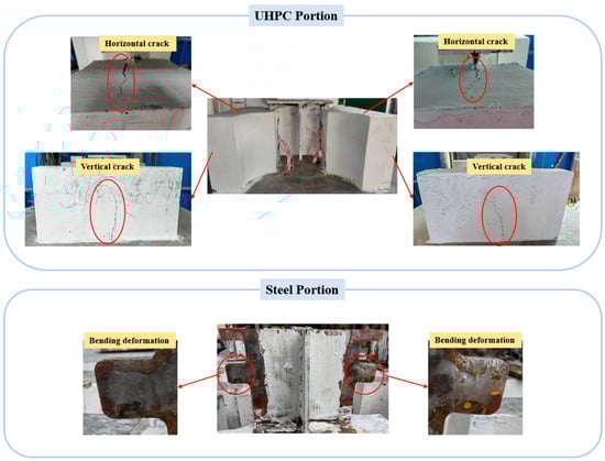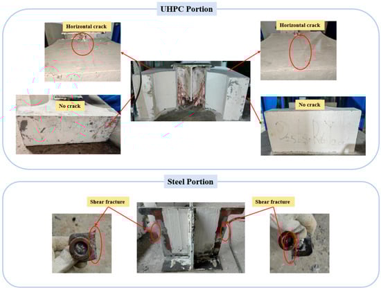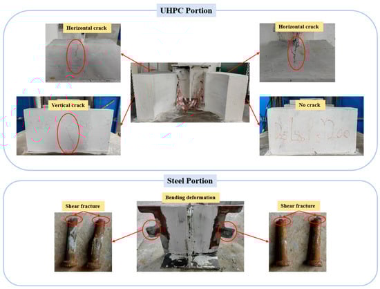 Both specimen groups exhibited localized crushing failure of concrete beneath the steel dowels and shear studs as the primary concrete damage mode. Specimen D25L80R16Y200 developed eccentric compression-induced cracks solely on the concrete’s top surface, whereas specimen D25L80R13Y200 exhibited additional prominent cracking on the north concrete face. Both specimens exhibited plastic bending deformation of steel dowels and shear studs, while divergent fracture locations were observed: Specimen D25L80R16Y200 failed via shear fracture at steel dowel roots, while specimen D25L80R13Y200 exhibited shear fracture at shear stud roots. The difference in fracture locations may relate to the stud diameter. In specimen D25L80R13Y200, the 13 mm diameter studs’ smaller cross-section resulted in insufficient load-bearing area at weld interfaces, causing plastic deformation in weld zones under load and ultimately leading to shear failure at stud roots.