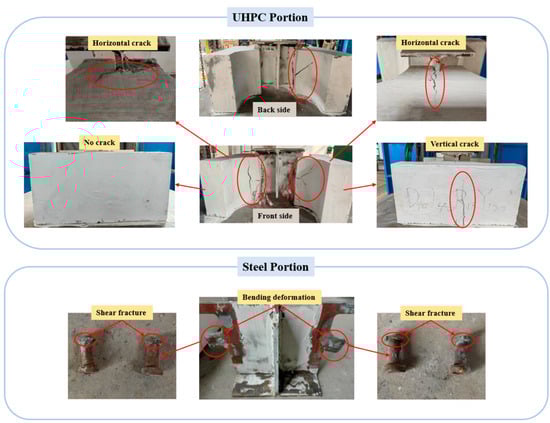 Specimens D25L40R13Y120 and D40L40R13Y120 developed cracks on north–south concrete surfaces and top surfaces. Additionally, prominent cracks formed in the concrete fillet regions, resulting from lateral thrust generated by the plastic deformation of shear studs during loading, which induced these cracks on both sides of the fillets. Comparative analysis of failure modes revealed that specimen D25L40R13Y120 exhibited more severe bending deformation in steel dowels, with direct shear fracture of the north dowel, while all four shear studs in specimen D40L40R13Y120 failed in shear at their roots. Relocating shear stud welding positions toward the web triggered premature cracking in concrete fillet regions and intensified damage at stud locations. This primarily occurred because shear resistance in specimen D40L40R13Y120 was primarily undertaken by shear studs, while reduced concrete thickness on both sides of the studs further contributed to premature cracking in fillet regions.