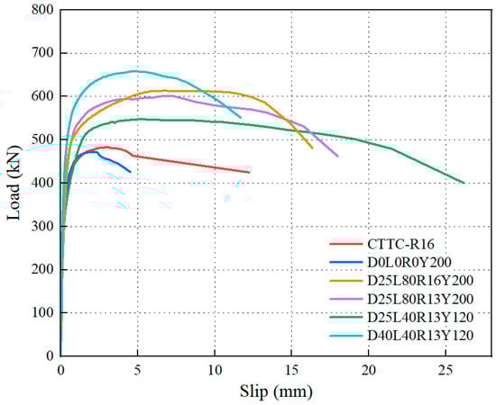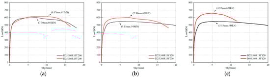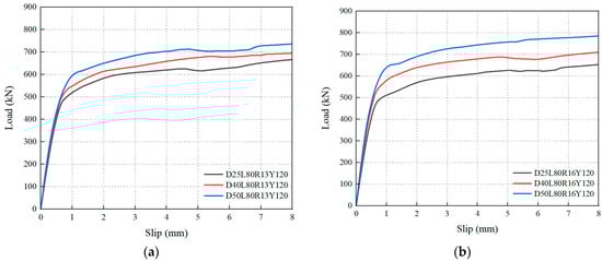 Figure 16a presents the load-slip curves of shear connector specimens with varied stud diameters but other identical parameters. Compared to the stud-free specimen (D0L0R0Y200), specimen D25L80R13Y200 exhibited a 27.3% enhancement in the ultimate load-bearing capacity. When the stud diameter increased to 16 mm (D25L80R16Y200), its load-bearing capacity exhibited a 29.7% higher enhancement rate compared to that of the stud-free specimen. Although increasing the stud diameter did not significantly enhance the ultimate load-bearing capacity, it improved the specimen ductility.