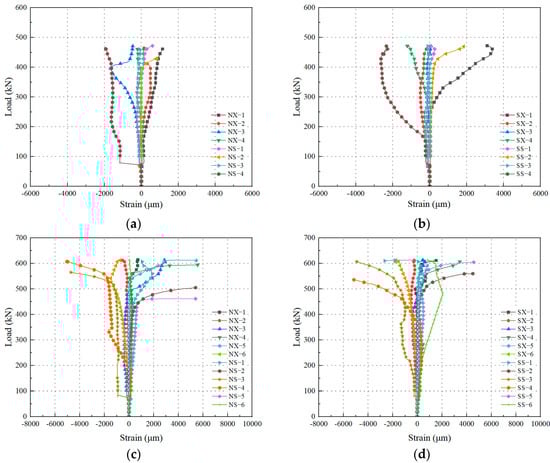 Load–strain curves derived from processed strain data collected by gauges on specimen steel dowels are presented in Figure 17. Tensile strains were recorded as positive values, while compressive strains were registered as negative values in strain gauge measurements.