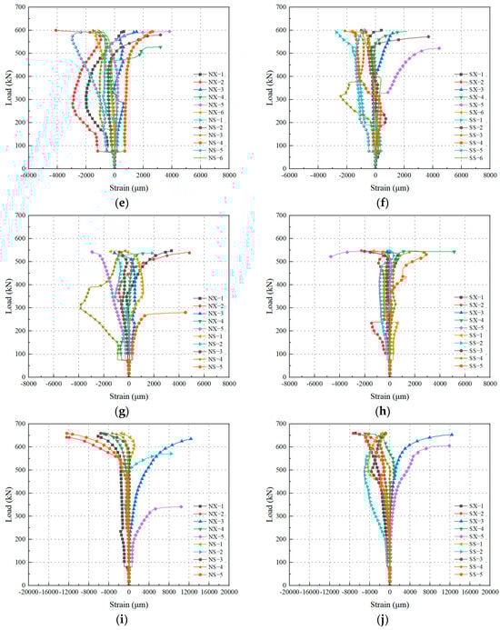 Load–strain curves of specimens. (a) North side of D0L0R0Y200; (b) south side of D0L0R0Y200; (c) north side of D25L80R16Y200; (d) south side of D25L80R16Y200; (e) north side of D25L80R13Y200; (f) south side of D25L80R13Y200; (g) north side of D25L40R13Y120; (h) south side of D25L40R13Y120; (i) north side of D40L40R13Y120; (j) south side of D40L40R13Y120.