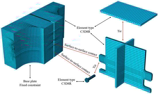 Finite element models were established using ABAQUS 2022 for analysis in this study. As illustrated in Figure 18, a complete model was established for the steel dowel–stud hybrid connector specimens to perform simulations. In this model, concrete blocks and steel plates with integrated dowels, studs, end plates, and rib plates were all modeled using C3D8R solid elements. Consistent with experimental conditions, fixed constraints were applied to the bottom surface of the concrete blocks, while vertical displacement was imposed at the reference point (RP-1) coupled to the end plate center. In the push-out test, stiffeners, end plates, and studs were integrally connected to steel plates via welding, which was modeled using tie constraints. Surface-to-surface contact was implemented between the composite shear connectors and concrete. During testing, significant mechanical interlock and frictional resistance only existed between the side surfaces of the dowel and concrete, whereas the bond strength at the front/rear faces of the dowel–concrete interfaces was negligible. Hence, in the finite element simulation, only the side surfaces of the dowel and stud surfaces were assigned as main contact surfaces, with concrete designated as a secondary surface. For the contact interactions, tangential behavior employed the penalty friction formulation, while normal behavior defaulted to hard contact, with separation permitted after contact.