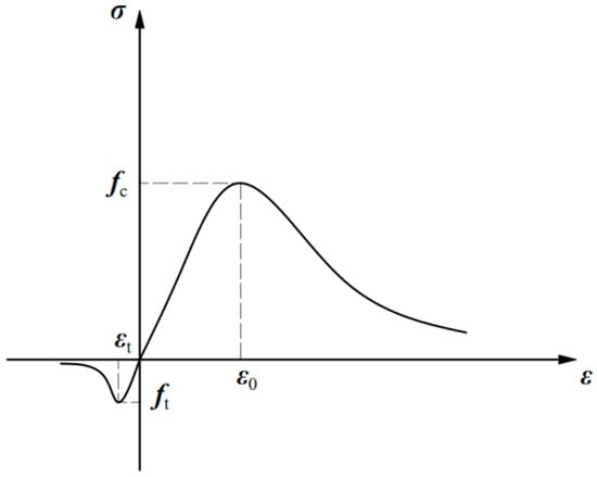 In finite element simulations, numerous constitutive models exist for concrete, with the Concrete-Damaged Plasticity (CDP) model currently adopted as the standard in ABAQUS 2022 due to its robust characterization of damage mechanisms. After comparative assessment, the stress–strain relationship proposed by Yang Jian [] was adopted for concrete in compression, while Du Renyuan’s model [] was implemented for the tensile constitutive behavior. The compressive stress–strain curve for concrete is given by Equation (1).