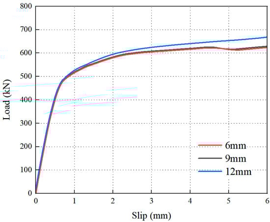 Figure 20 shows the load-slip curves for different mesh sizes. When the mesh size exceeded 9 mm, the load-slip curves exhibited oscillatory convergence. When the mesh sizes were 9 mm and 6 mm, the load-slip curves demonstrated good convergence. A global mesh size of 9 mm was adopted to improve the computational efficiency, with local refinement applied at the stud and dowel regions. The circumferential element size around the stud was controlled at 4 mm, and the element size along the length direction was controlled at 8 mm.