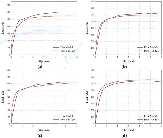 Load-slip curves of FEMs with different stud welding locations. (a) Specimens with a stud diameter of 13 mm; (b) specimens with a stud diameter of 16 mm.