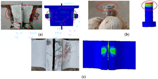 Comparison of test and simulated damage patterns of specimen D25L40R13Y120. (a) Damage pattern comparison at dowel zones; (b) damage pattern comparison at stud zones; (c) damage pattern comparison at the concrete fillet.