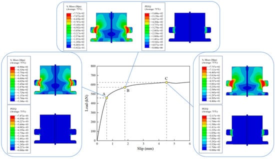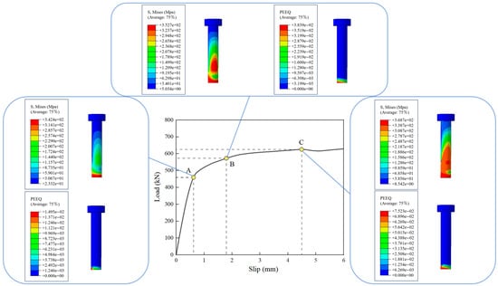 Figure 23 presents the load-slip curve of specimen D25L80R13Y200, along with the development of von Mises stress and equivalent plastic strain around the steel dowel. Points A and B in the figure represent the von Mises stress in the steel dowel reaching the yield strength and tensile strength of the steel material, respectively; point C indicates that the shear connector load reached its peak value. Before point A, the steel dowel was in the elastic stage, during which stress was concentrated at the root and rapidly increased. At point A, the steel dowel root began to reach the yield load and commenced the strain-hardening stage; after the slip displacement passed point A, the specimen stiffness decreased with further slip increases, while plastic strain rapidly accumulated at the steel dowel root. At point B, the load reached approximately 92% of the peak load, and the steel dowel completed the strain-hardening stage. Following the completion of the strain-hardening stage at the steel dowel root, stress variations diminished significantly, resulting in markedly slower load growth. A penetrating plastic strain region formed throughout the root section of the steel dowel. As the slip displacement increased to point C, the maximum plastic strain at the steel dowel root reached 0.21, triggering plastic failure of the dowel and cessation of its load-bearing function, while the shear capacity of the connector assembly concurrently attained its peak value.