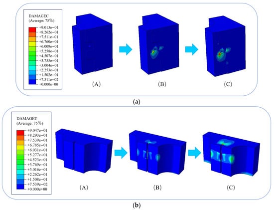 Failure progression of the HPC. (a) Compressive damage variable in the concrete beneath the steel dowel and stud; (b) tensile damage variable at the concrete fillet.