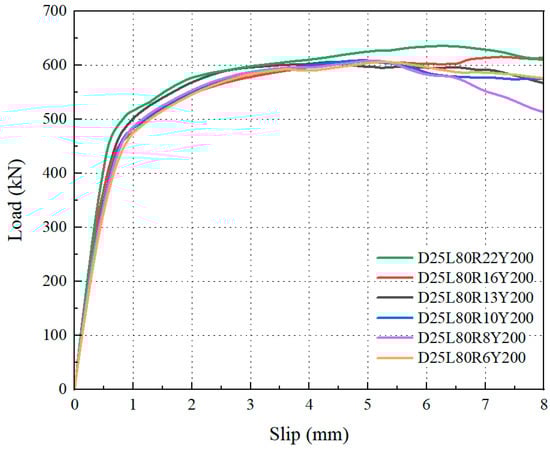 Parametric simulations were conducted to investigate the influence of the stud diameter on the hybrid connector’s shear performance, systematically evaluating six nominal diameter specifications, encompassing 6 mm, 8 mm, 10 mm, 13 mm, 16 mm, and 22 mm. The load–displacement curves of these models are presented in Figure 26. All the models exhibited typical linear elastic responses during the initial loading, with stiffness values ranging between 753 and 809 kN/mm and increasing with increasing stud diameter. After the elastic stage, D25L80R22Y200 exhibited significantly higher ductility compared to those of the other models, demonstrating superior plastic energy dissipation capacity.