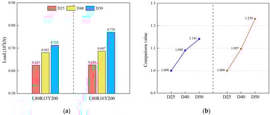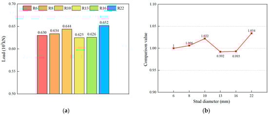 The effect of the stud diameter on the shear capacity. (a) Ultimate load-bearing capacity; (b) ultimate load-bearing capacity ratio.