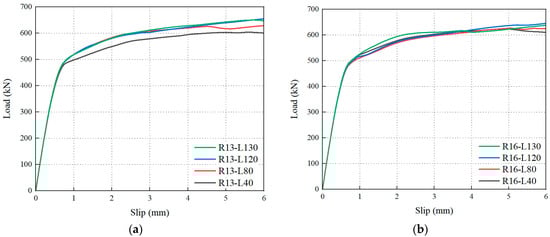 Load-slip curves of FEMs with varying stud lengths. (a) Specimens with a stud diameter of 13 mm; (b) specimens with a stud diameter of 16 mm.