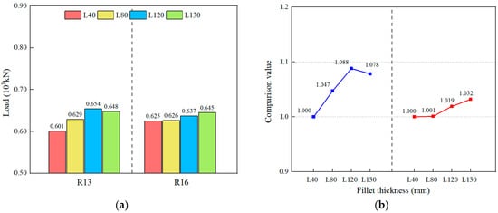 The effect of the welding location on the shear capacity. (a) Ultimate load-bearing capacity; (b) ultimate load-bearing capacity ratio (Blue line: 13 mm diameter; Red line: 16 mm diameter).