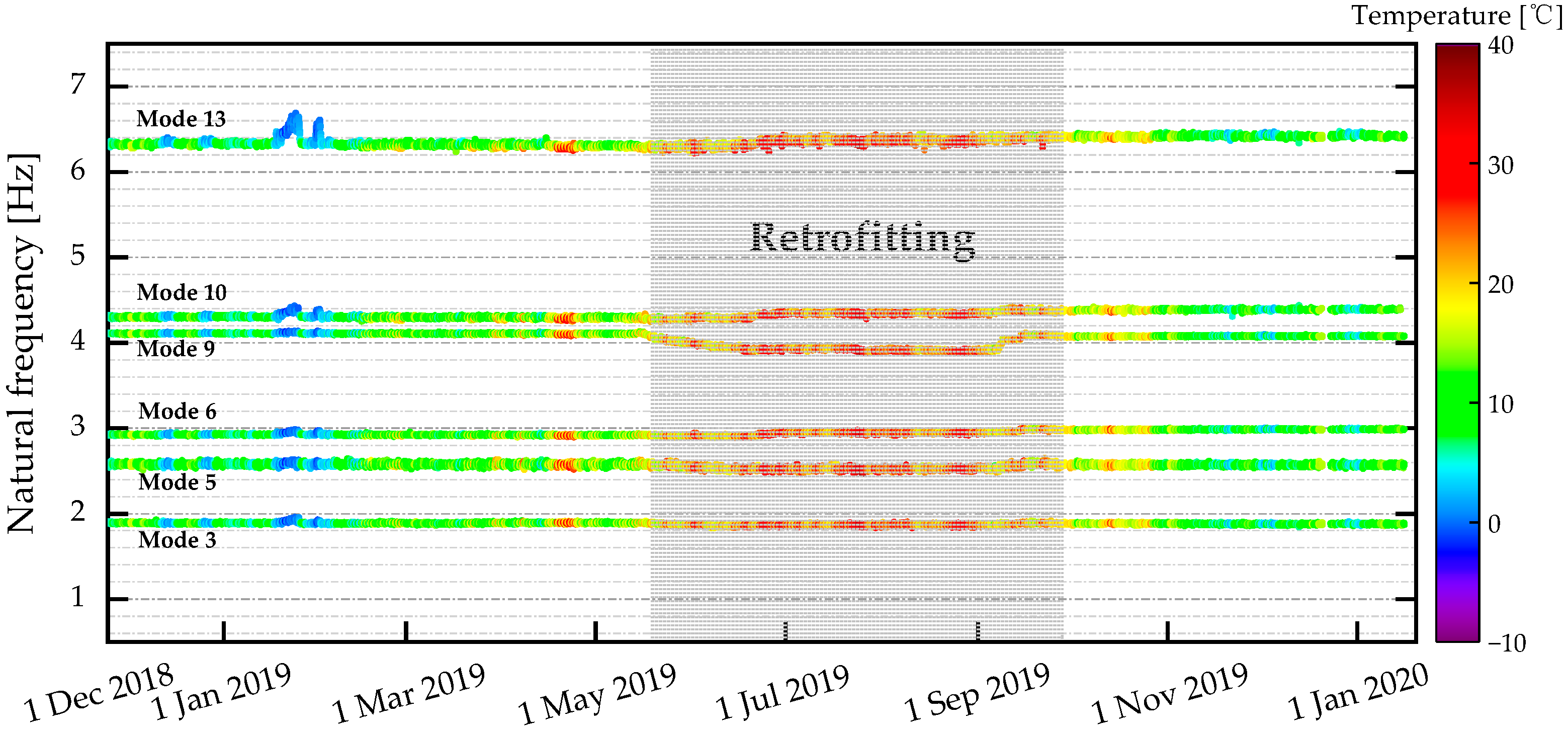 The monitoring campaign of the KW51 bridge spanned three operational states: a 7.5-month period before retrofitting (2 October 2018–15 May 2019), the retrofitting period (16 May–27 September 2019) and a 3.5-month period after retrofitting (28 September 2019–15 January 2020). During this time, the sensor network was progressively enhanced, yielding a dataset comprising acceleration, strain, displacement, temperature and humidity measurements. Structural vibration responses from train-induced and ambient sources were captured by 12 accelerometers installed on the deck and arches. Operational modal analysis was conducted on an hourly basis based on ambient vibration responses to track the evolving dynamic characteristics of the KW51 bridge [