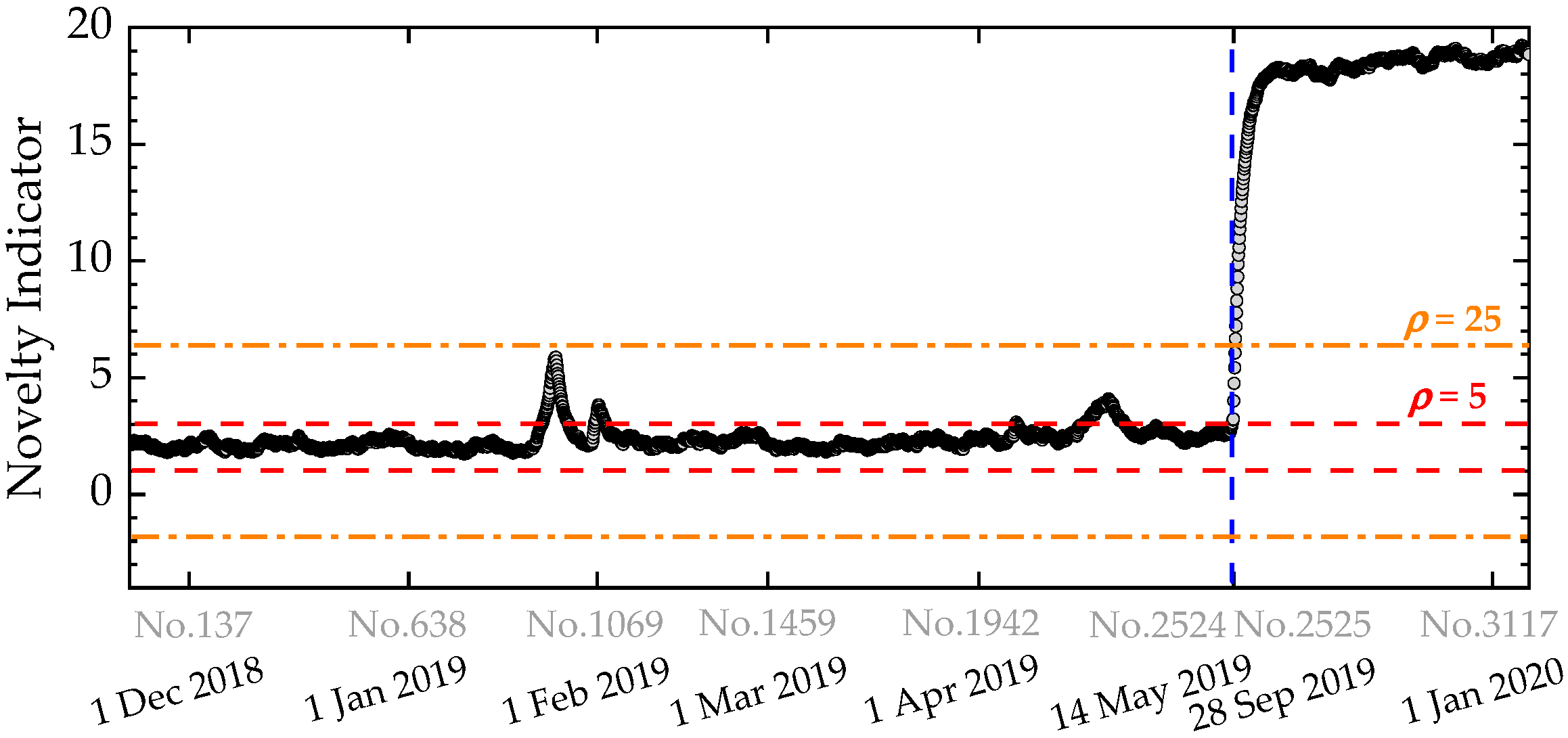 Finally, Dataset 2 retains incomplete frequency vectors and therefore cannot be processed by RPCA. Integrating NLRMC into the pipeline enables, within each moving window, simultaneous recovery of the underlying low-rank structure, isolation of sparse corruptions, and completion of missing entries; this restores the operability of the OP-based residual strategy under severe data missingness, improves data utilization and yields timely, reliable detection of structural change. This capability—robust anomaly detection on partially observed and corrupted data via a unified NLRMC-OP pipeline—represents the central contribution of the present work.