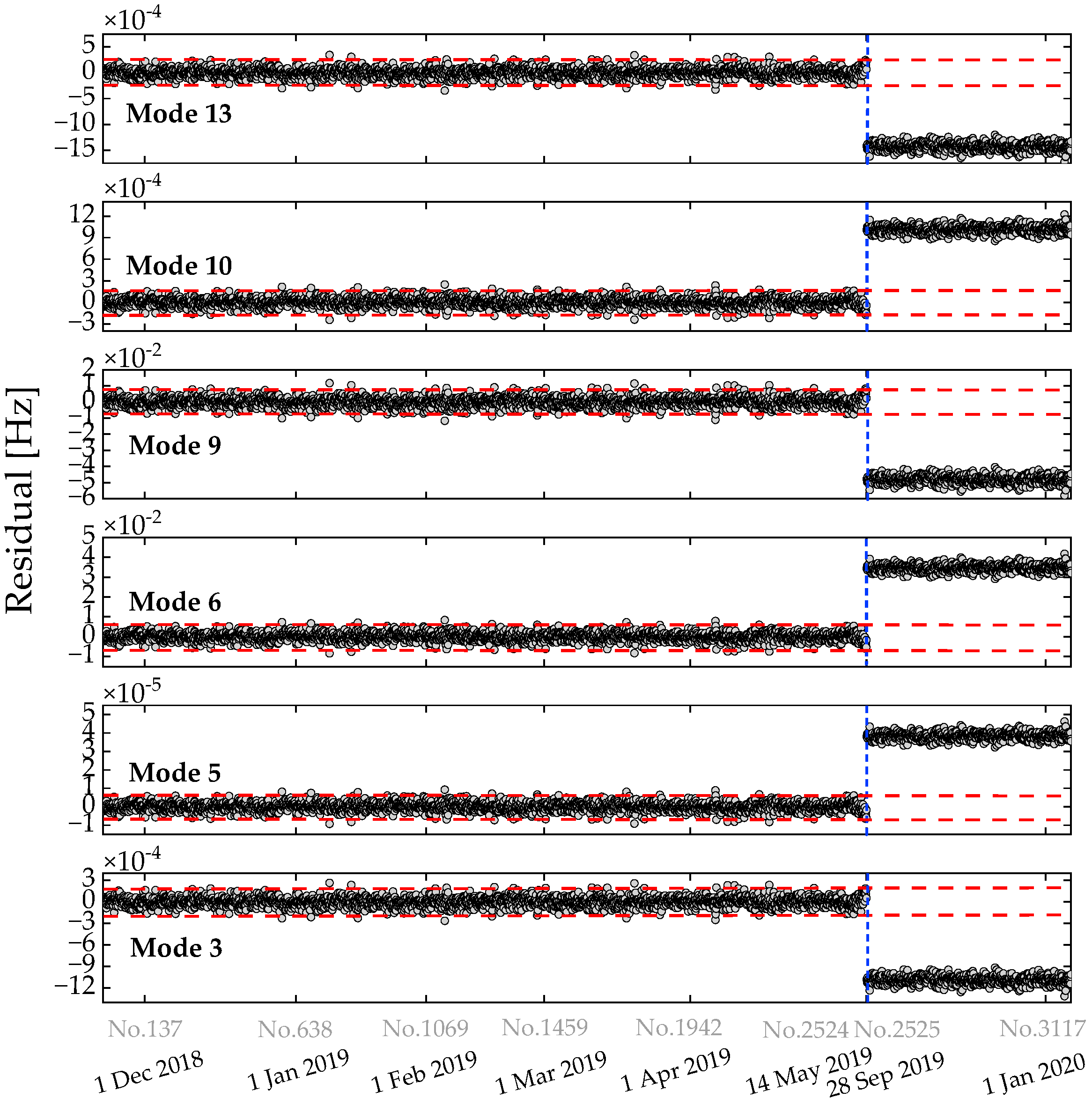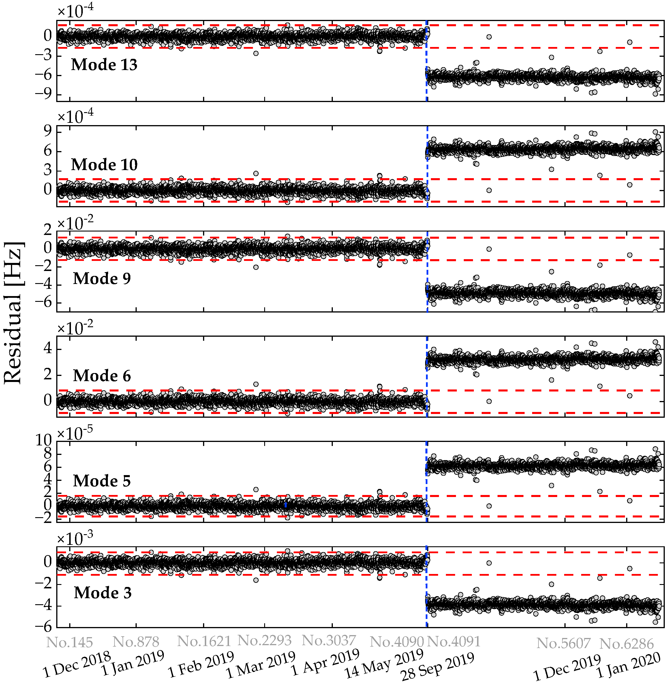 It should be emphasized that the removing gaps of samples in Dataset 1 caused the URs of the raw frequency data for the other modes to fall to less than half. More importantly, the first sample in Dataset 1 after retrofitting (i.e., the 2525th sample) corresponds to a timestamp of 18:00 on 28 September 2019, even though the actual retrofit having been completed on 27 September 2019. In reality, monitoring of such structural changes due to after retrofitting started at midnight on 28 September, so the gap-removal operation in Dataset 1 deleted all samples between 00:00 and 18:00, also seen in