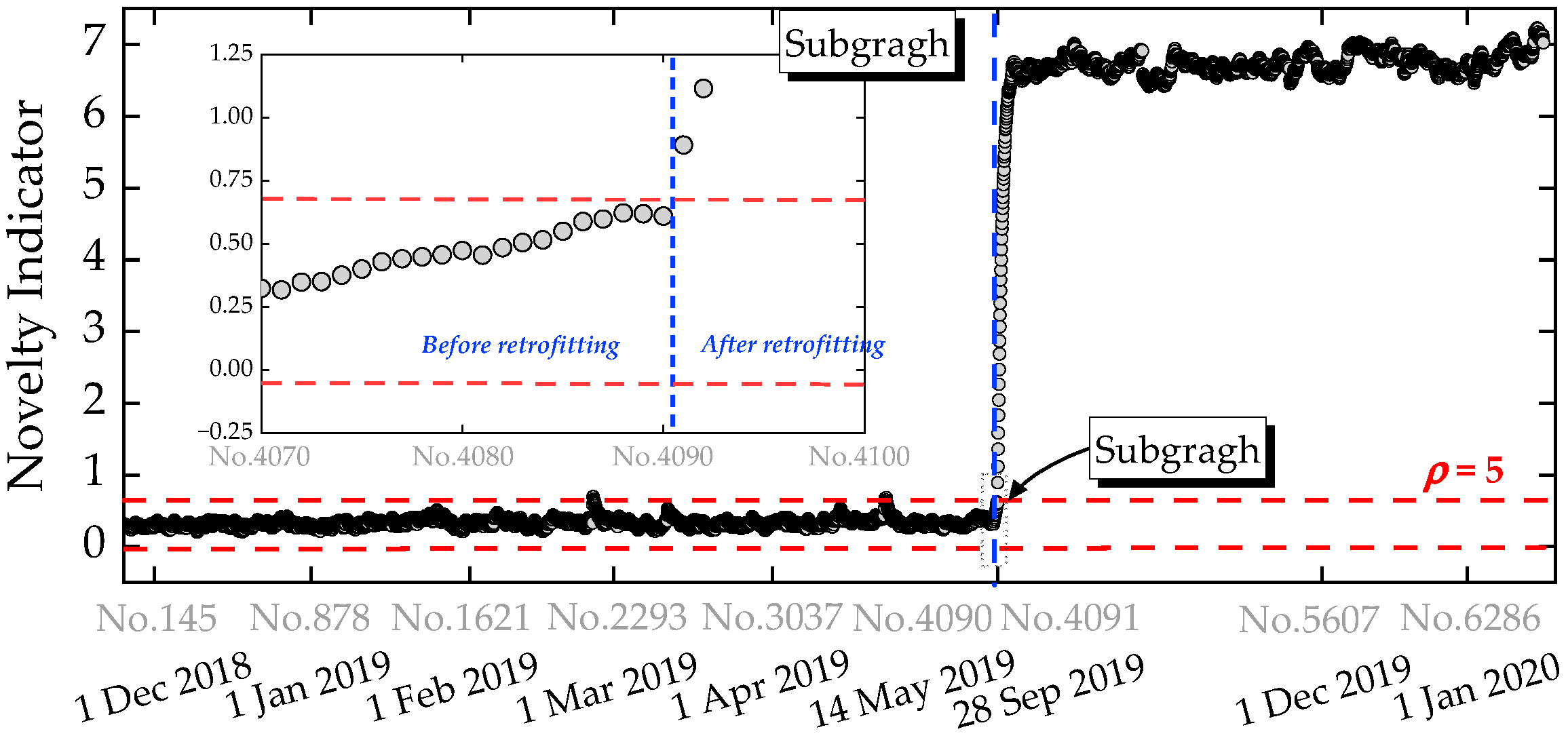 to 25, structural anomalies after retrofitting were still misclassified as normal, as evidenced by the data points after the blue dashed line in