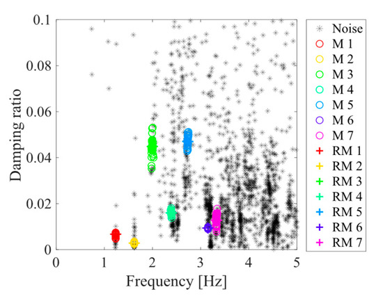 - Zeng, J.; Hu, Z. Automated Operational Modal Analysis Using Variational Gaussian Mixture Model. Eng. Struct. 2022, 273, 115139. [Google Scholar] [CrossRef]