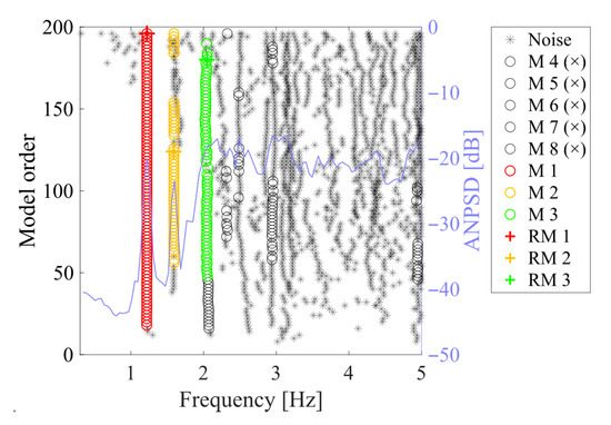- Qin, S.; Kang, J.; Wang, Q. Operational Modal Analysis Based on Subspace Algorithm with an Improved Stabilization Diagram Method. Shock Vib. 2016, 2016, 7598965. [Google Scholar] [CrossRef]