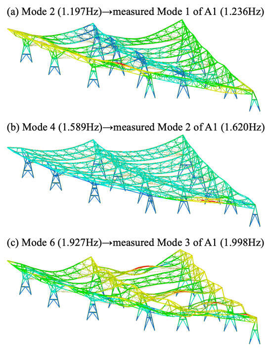 - The comparison of the first three mode shapes for Towers A1 and A2 is summarized in Table 7. Although the overall mode shapes are broadly similar, a notable difference appears in the second mode, which is dominated by in-plane motion. In the reinforced Tower A1, the largest amplitude occurs at the crossbeam, and the out-of-plane components on both sides (#4 and #6 in Table 3) remain essentially consistent, indicating no relative torsion. In contrast, in the unreinforced Tower A2, the second mode shows its maximum amplitude on the west side of the crossbeam, while the out-of-plane components on the two sides (#4 and #6 in Table 5) differ significantly, producing a clear relative torsional response.