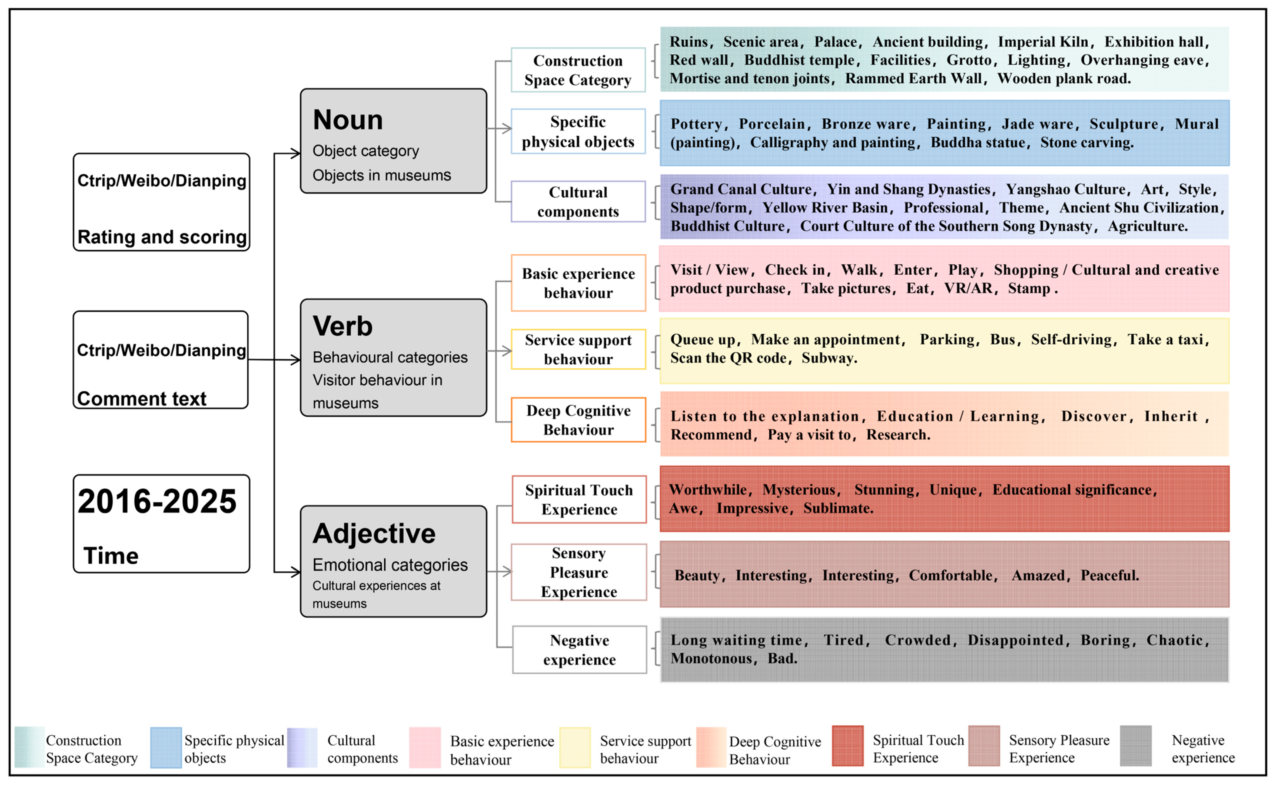 Following cleaning, the text was normalized, and high-frequency words related to visitor behaviors in cultural heritage parks and museums were extracted for preliminary coding. Comments were then categorized into three major dimensions: objects of concern, cultural experiences, and visiting behaviors. Within this framework, relevant nouns were classified as objects of concern, verbs and associated nouns as behavioral activities, and adjectives as indicators of cultural experience.
