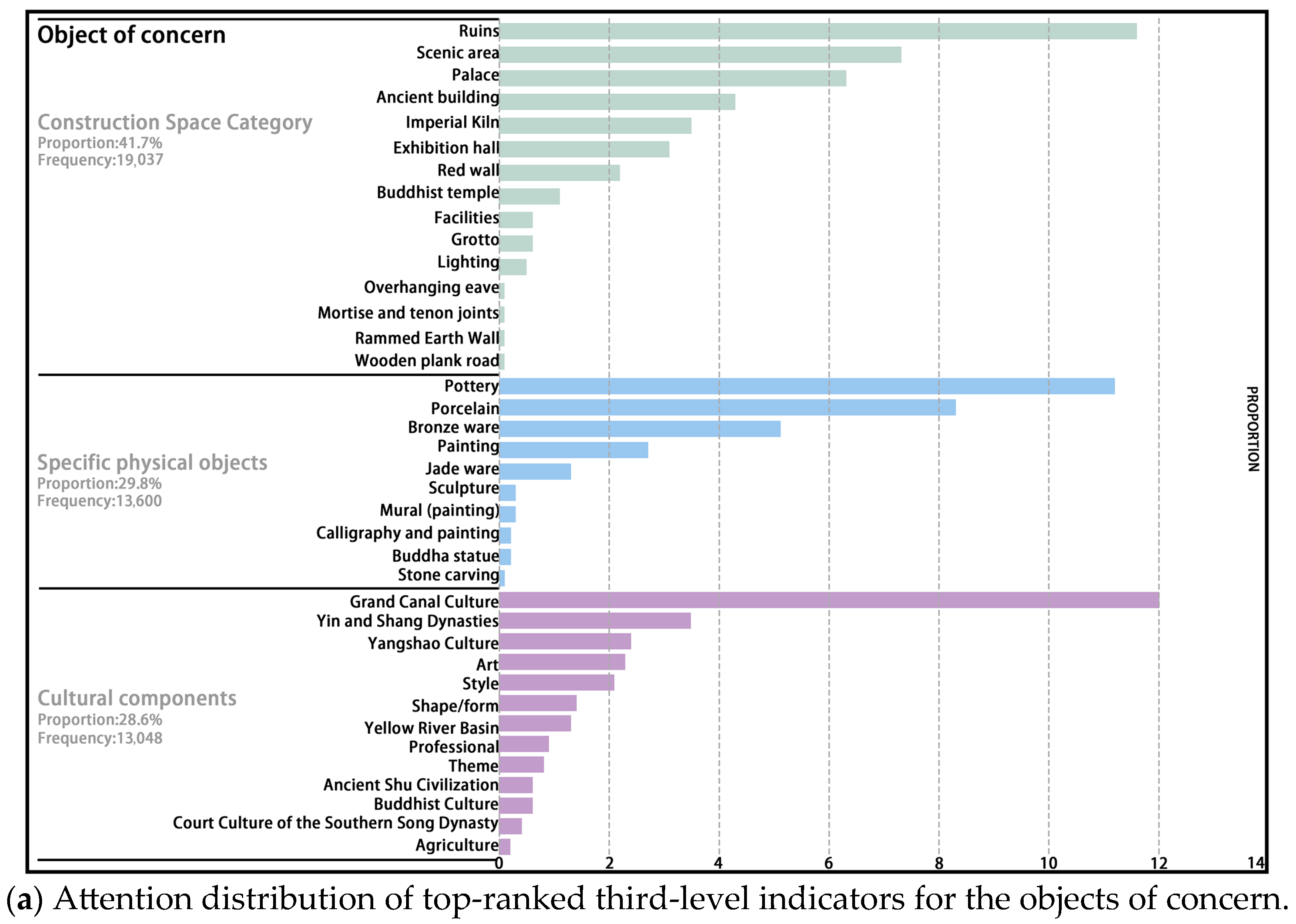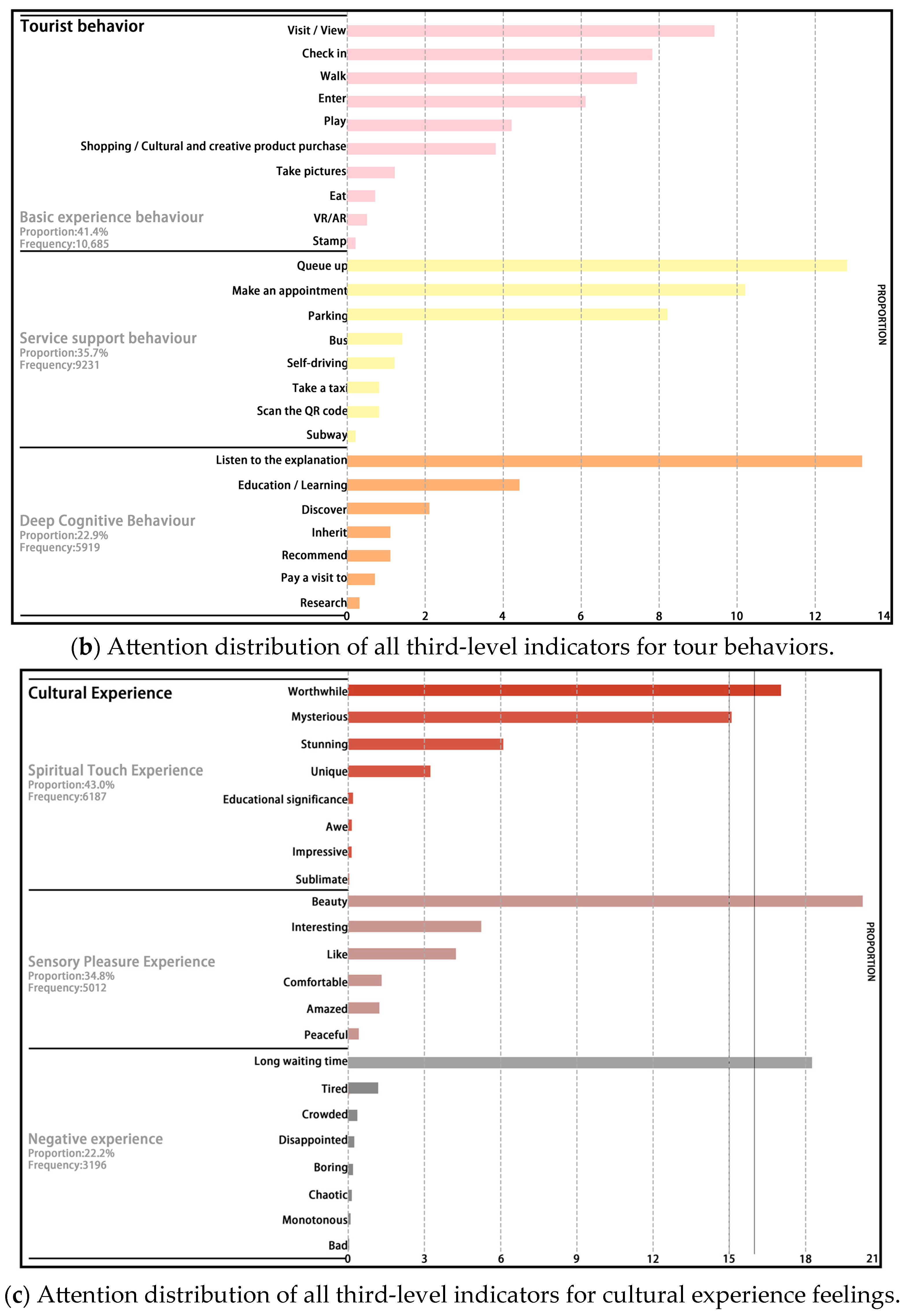 Analysis of word frequencies across the three indicator categories revealed that objects of concern were mentioned most frequently, appearing 25,575 times and accounting for 54.43% of all references. This was followed by excursion activities, with 12,297 mentions (26.17%), and cultural experience, with 9115 mentions (19.4%). The substantial number of references reflects both the popularity of cultural heritage parks and museums and the fact that visitors’ post-visit comments tend to emphasize descriptions of objects of interest, such as relics, cultural elements, and historical features, as well as excursion activities, including clocking in, taking photographs, and touring.