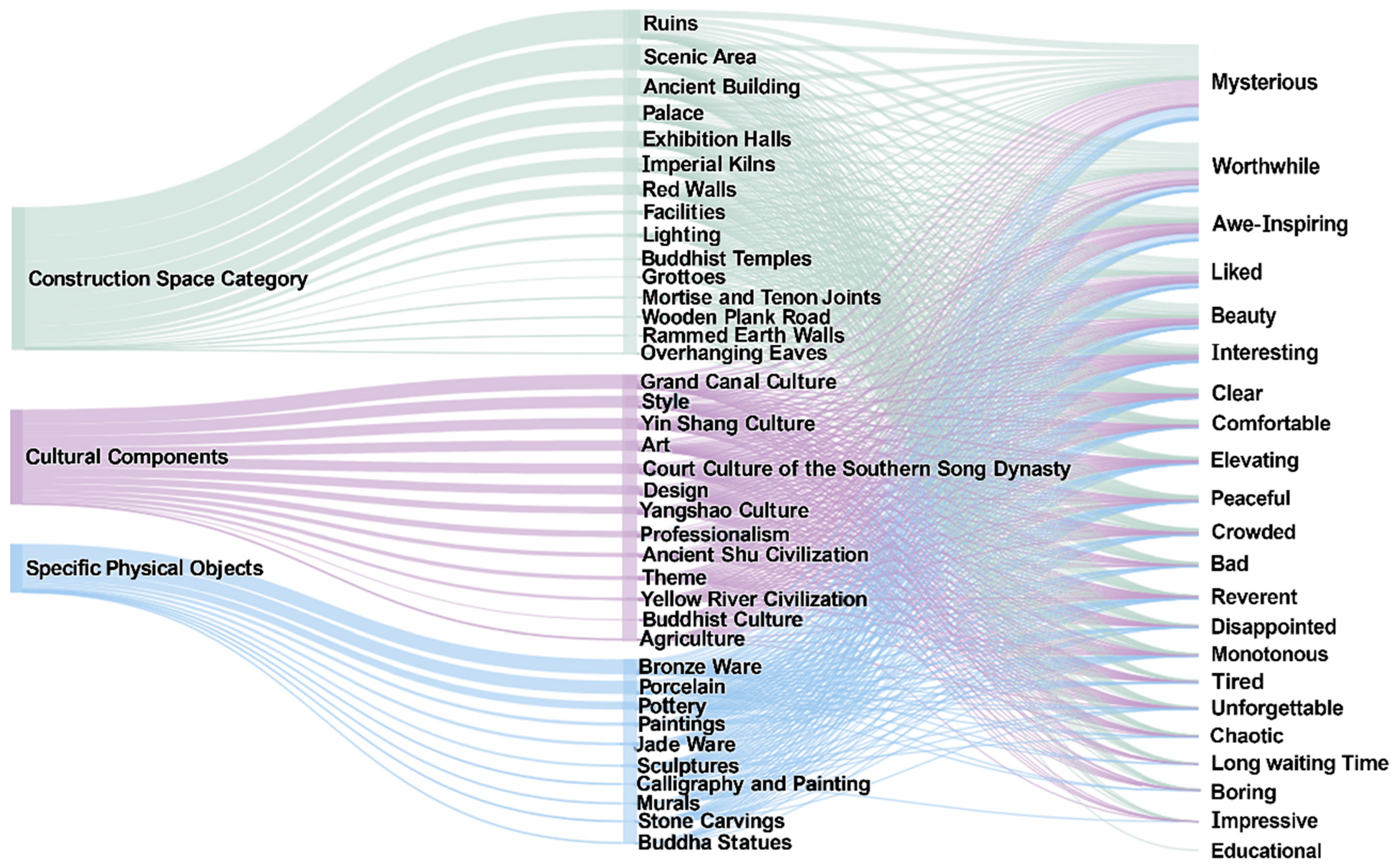 Architectural environments serve as the core medium for deep emotional experiences. Spatial markers such as ruins, scenic spots, ancient buildings, and palaces are strongly associated with in-depth responses like a sense of mystery, worthwhileness, and amazement. In contrast, functional spaces like exhibition halls and imperial kilns show weaker links to feelings of interest and comfort. Notably, technical architectural terms (e.g., rammed-earth walls) are predominantly tied to negative impressions like monotony, while negative feelings of crowding and fatigue are clearly linked to management-intensive spaces such as exhibition halls and scenic areas.
