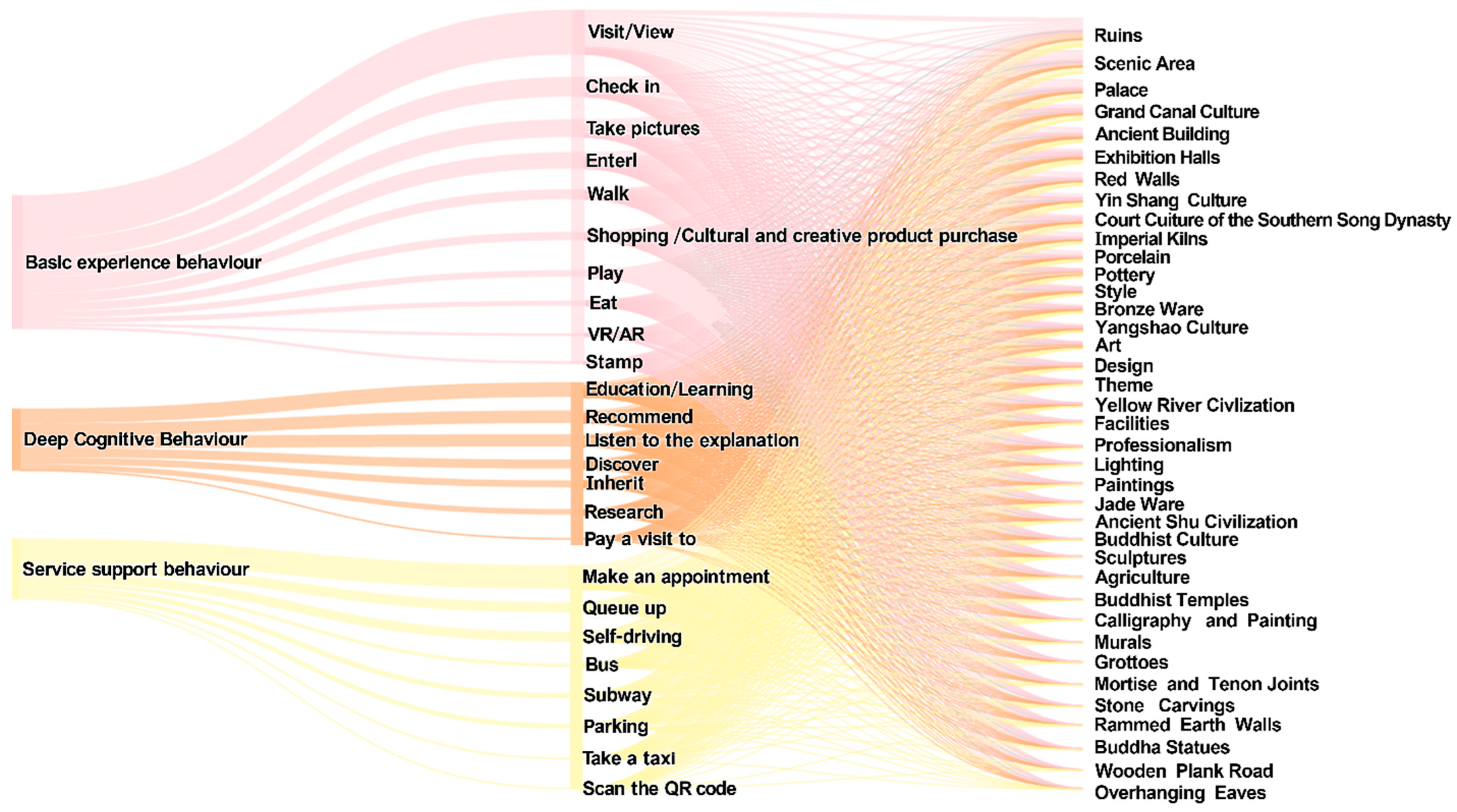 Figure 6 reveals the correspondence between touring behaviors and objects of concern. The analysis shows a clear hierarchy in the strength of these associations: basic experiential behaviors exhibit the strongest links, followed by in-depth cognitive behaviors, while service support behaviors demonstrate the weakest correlations. This hierarchy is further detailed in a descending order of association strength for specific behaviors: visiting/viewing, education, recommending, listening to lectures, discovering, inheriting, making reservations, walking, taking photographs, conducting research, and entering.
