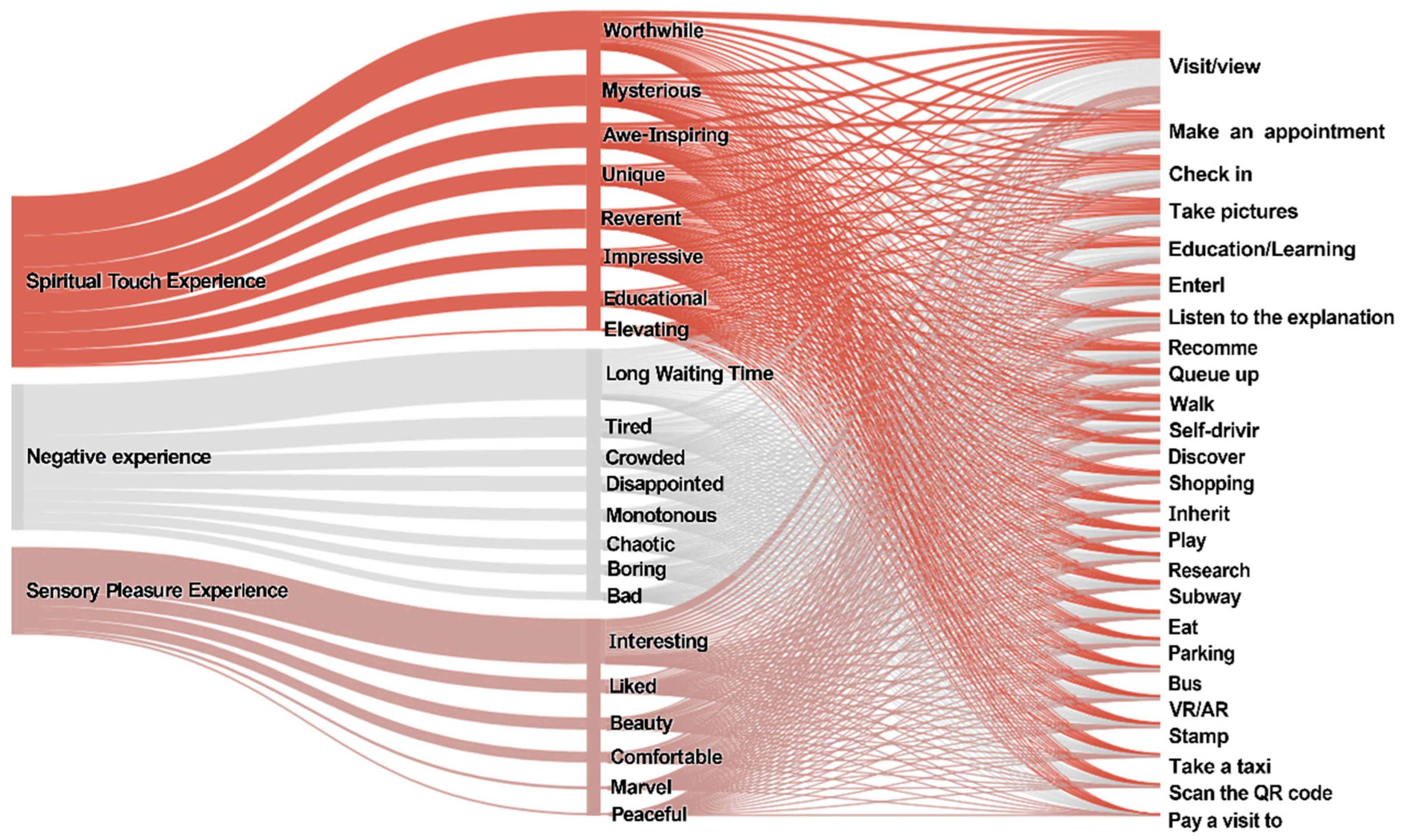 Figure 7 illustrates how specific behaviors trigger experiential feelings, revealing a clear hierarchy: spiritual engagement has the strongest link to behaviors, followed by negative feelings, with sensory pleasure being the weakest. This is further detailed by the most prominent feelings in descending order: long queue, interesting, worthwhile, mysterious, marvelous, tiredness, unique, awe, impressive, crowded, and disappointment.