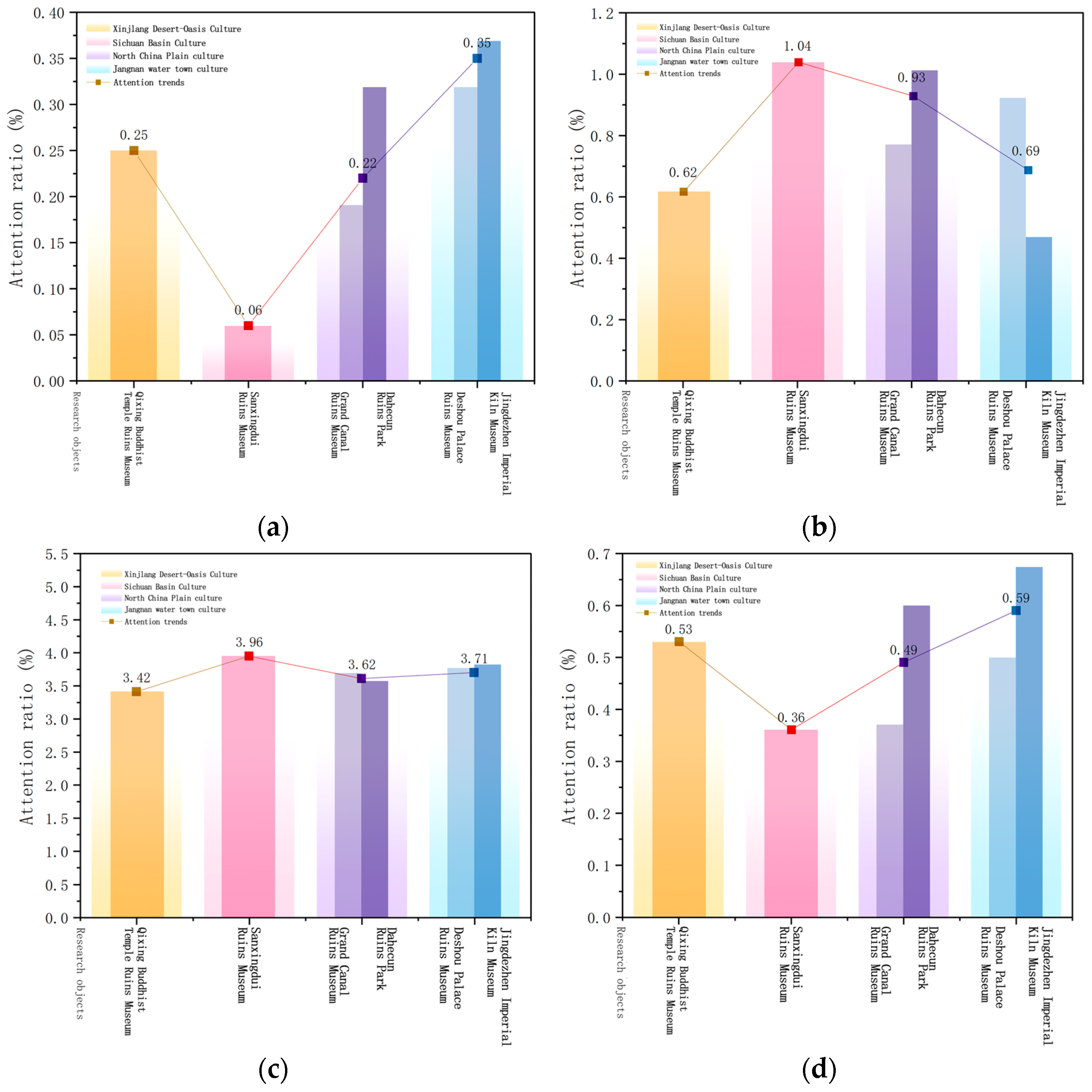 Figure 8d) shows that, at the regional level, the Jiangnan Waterfront registers the highest proportion of attention in the aesthetic dimension (0.59%). The other cultural regions follow in order: Xinjiang Desert–Oasis culture (0.53%), North China Plain culture (0.49%), and Sichuan Basin culture (0.36%). Visitors’ aesthetic evaluations of heritage site museums are jointly shaped by the cultural origins of each region, the immediacy and universality of aesthetic expression, and the quality of contemporary architectural and landscape design. Accordingly, the Jiangnan Waterfront culture, with its mature aesthetic tradition, receives the highest level of attention.