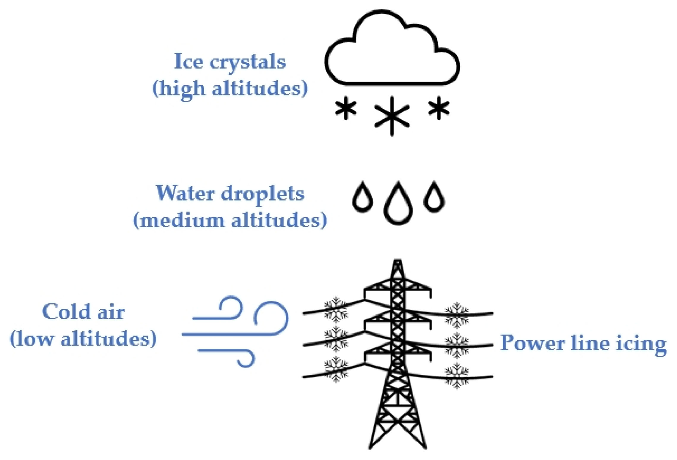 Icing formation is a complex phase transition process resulting from the coupled effects of thermodynamics and fluid dynamics under specific meteorological conditions [11]. When the ambient temperature is near freezing (typically ranging from −5 °C to 0 °C), the relative humidity exceeds 85%, and the wind speed ranges between 3 m/s and 15 m/s, ice crystals descending from higher altitudes melt into supercooled water droplets upon passing through a warmer mid-layer atmosphere above freezing. These droplets then undergo freezing upon contact with cold conductor surfaces. In contrast, if the air temperature above the line is too low, precipitation freezes completely in the air, significantly reducing the risk of ice accumulation on conductors [12], as illustrated in Figure 1.